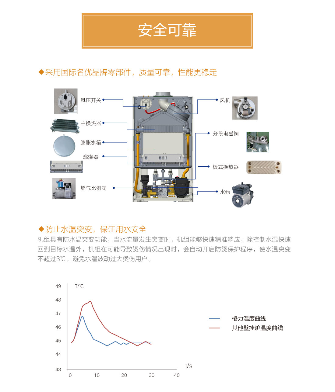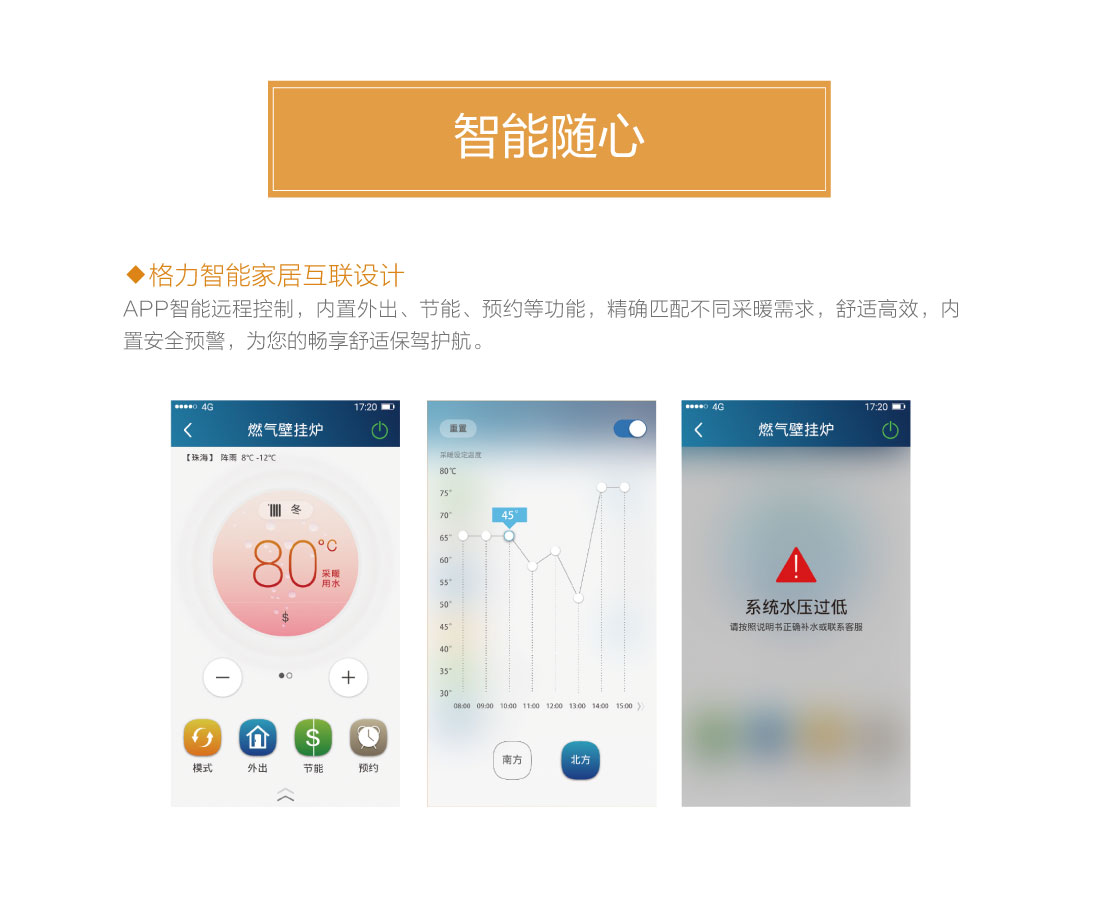 分段燃燒,20%~100%寬域功率輸出,防止夏季水溫過高過燙,智能水溫調(diào)節(jié),±0.5℃精準(zhǔn)控溫,溫度設(shè)定廣,生活熱水35℃~60℃,暖氣片供暖用水30℃~80℃,地暖供暖用水30℃~60℃